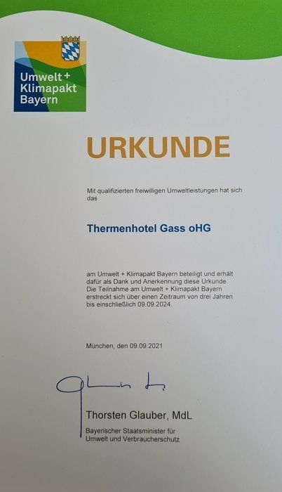 Am Donnerstag, den 25.11.21 waren wir zu Gast bei unserem Landrat Raimund Kneidinger. Wir hatten die Ehre zusammen mit der Familie Freudenstein vom Hotel Mühlbach, als eines von 2 Häusern in Bad Füssing die Urkunde des "Umwelt und Klimapakt Bayern" in Empfang zu nehmen. Herr Landrat Kneidinger und Bürgermeister Kurz übermittelten beste Grüße vom bayerischen Staatsminister für Umwelt- und Verbraucherschutz, Herrn Thorsten Glauber, und stellten beide gemeinsam dar, wie wichtig der Umweltschutz in der heutigen Zeit ist. Bürgermeister Kurz freute sich, dass 2 Häuser aus seiner Gemeinde diese Urkunde erhalten. Wir freuen uns, gemeinsam mit unserem Team und unseren Gästen einen Beitrag zum Umweltschutz zu leisten. Nur gemeinsam werden wir diesen Weg weitergehen können. Vielen Dank an Alle, die uns dabei helfen, einen ökologischen Fußabdruck zu hinterlassen. Ihre Familie Gass