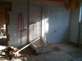 Pünktlich am Montag, den 21.11. standen viele Helfer bereit, um die Praxis auszuräumen. Nach dem entfernen der alten Trennwände sowie dem Ausräumen der Praxis wurden auch die alten Bodenbeläge entfernt. Zur Zeit noch unvorstellbar, dass hier in 2 Monaten eine Massagepraxis mit Wellnessambiente entsteht.
