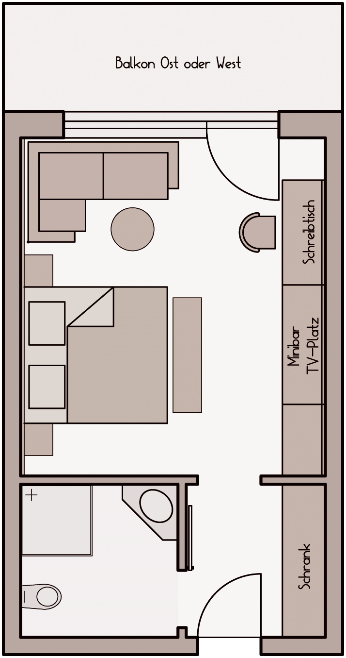 Zu jedem Zimmer gehört selbstverständlich ein Balkon zum privaten Draußensitzen. Einfach herrlich, auf das bunte Treiben am Pool zu schauen (Ostseite) oder genießen Sie die Nachmittags- und Abendsonne (Westseite).